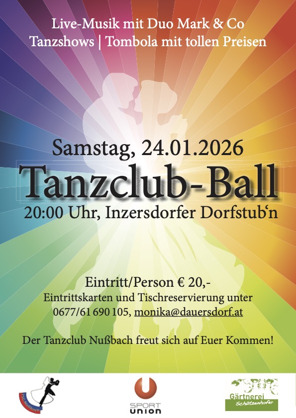 Immer sonntags von 19 bis 21 Uhr schweben sie über das Parkett im Mehrzwecksaal Nußbach. In gemütlicher und familiärer Atmosphäre tanzen 15 Paare aus allen Altersschichten Langsamer Walzer, Wiener Walzer, Quickstep, Tango, Slowfox, Cha Cha Cha, Rumba, Samba, Jive, Boogie, Salsa und Discofox.